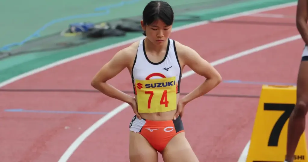 Watch an athletic Asian woman in her 20s posing on a track and field, wearing orange and black athletic wear with a yellow bib number 74.