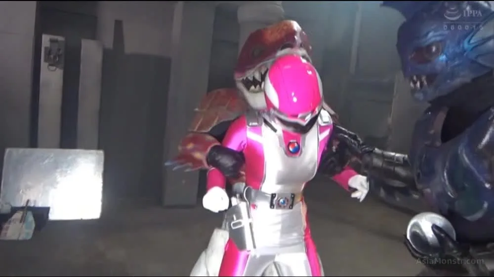 Watch an Asian woman in a provocative costume ride a motorcycle and pose in fighting stances in various settings