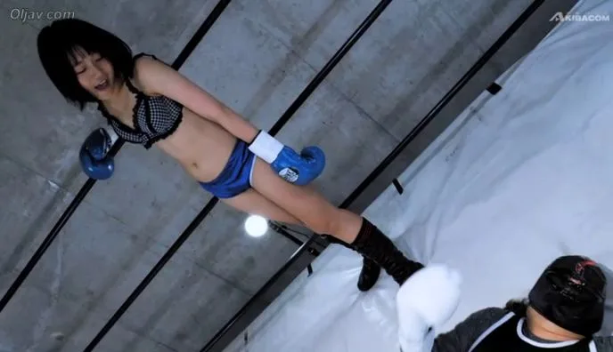 Watch a slim Asian girl with black bob hair engage in boxing activities, wearing blue boxing gloves and shorts, in a ring and gym.