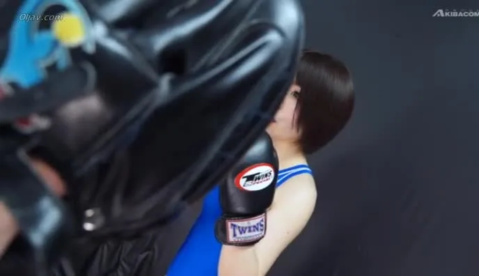 Watch an Asian woman in a blue leotard engage in a boxing match, wearing black boxing gloves. Soft lighting and studio setting.