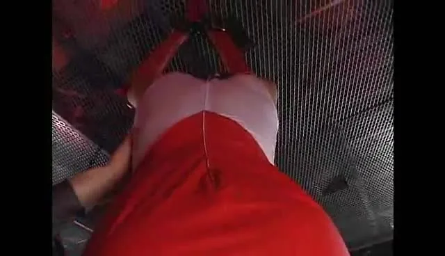Watch a young Asian woman in a revealing white and red costume posing and being touched in a red-lit room.
