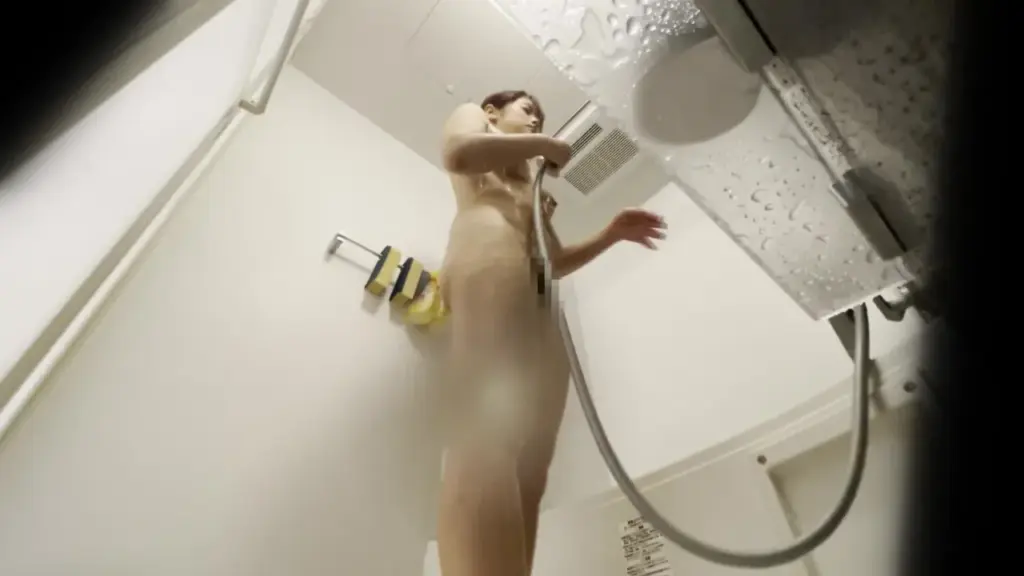 Watch a slim Asian woman shower alone in a steamy bathroom, captured in POV from a low angle.
