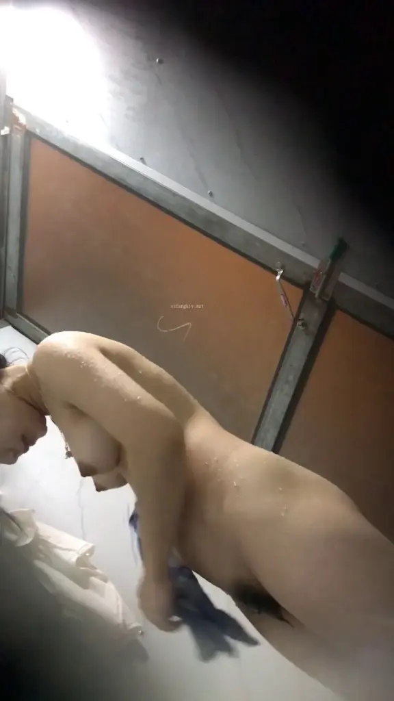 Watch a slim Asian woman with a tattoo on her left shoulder showering in a bathroom with a blue towel, captured in POV.