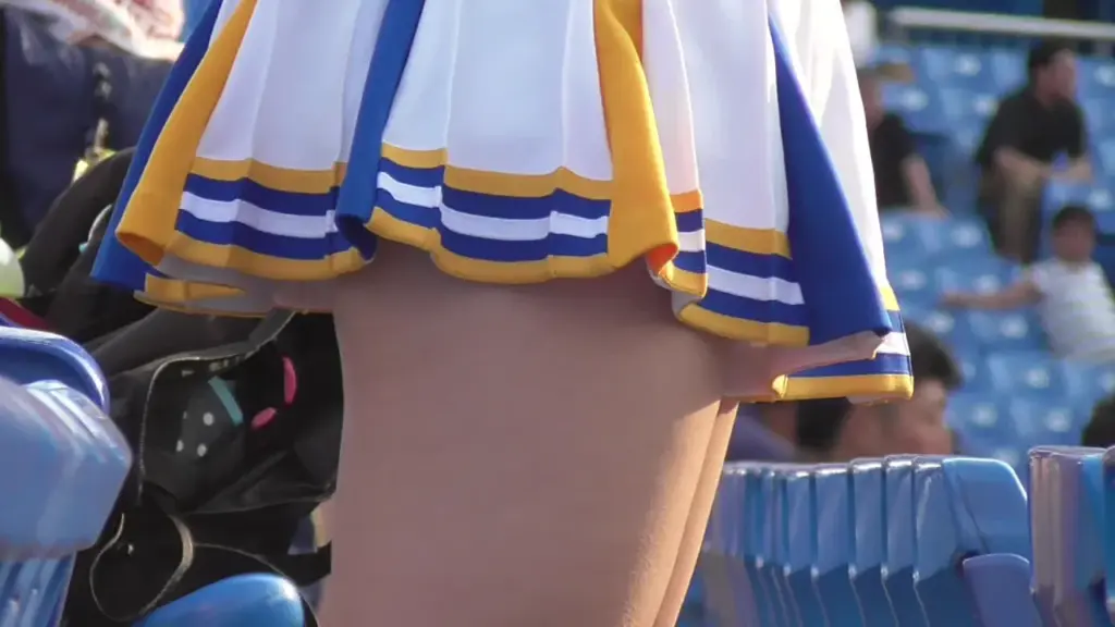 Watch a slim Asian cheerleader in a stadium, wearing a cheerleading uniform, captured in close-up and medium shots.