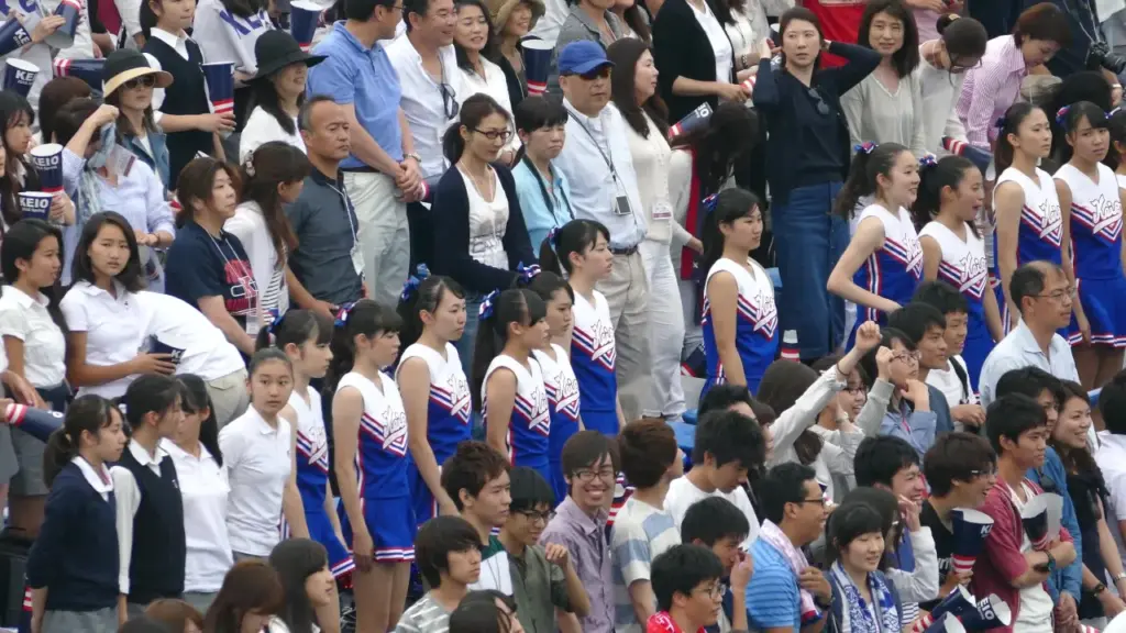 Watch Asian cheerleaders performing in blue and white uniforms, surrounded by spectators in a stadium or arena