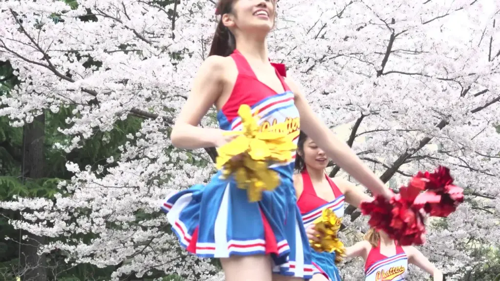 Watch a group of Asian cheerleaders perform in a beautiful park surrounded by cherry blossom trees, pom-poms in hand.