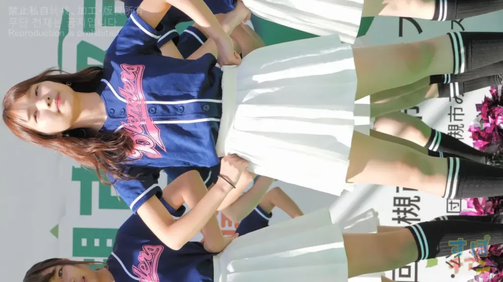 Watch four Asian teen cheerleaders in uniforms performing outdoors at an event or festival with pom-poms, energetic and lively