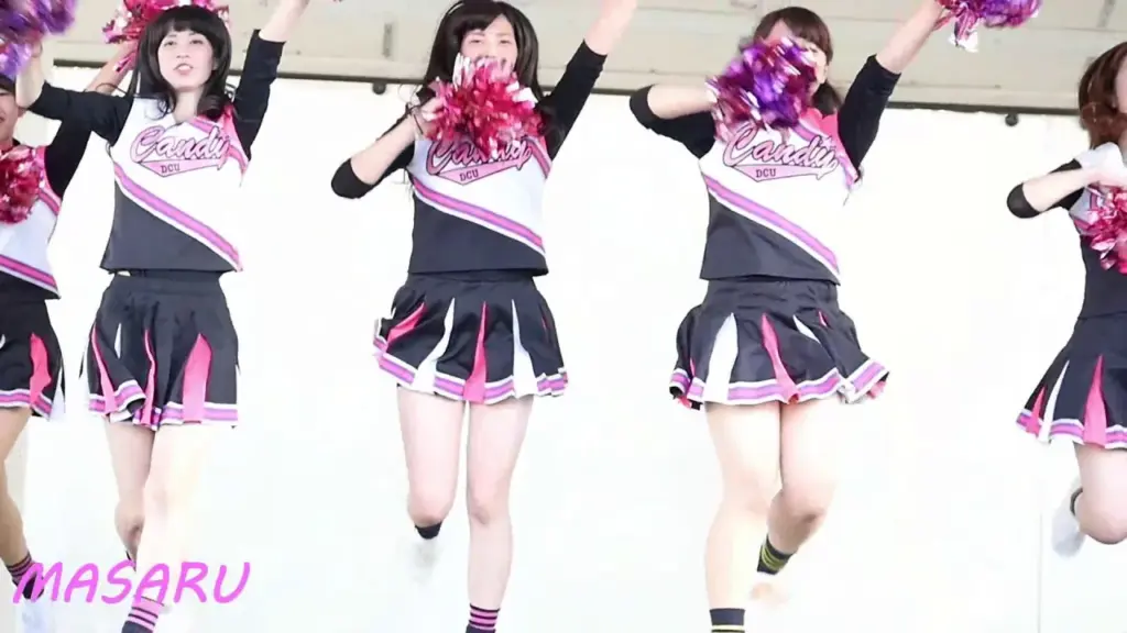Watch slim Asian cheerleaders performing on stage with pom-poms in energetic poses and jumps.