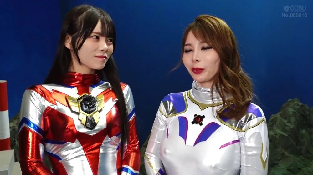 Watch two Asian babes in revealing costumes posing in a studio setting, then interacting with a monster prop in dramatic lighting.