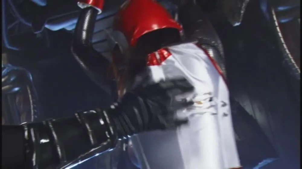 Watch two Asian women in red and white costumes engage in a thrilling fight scene, both indoors and outdoors, with machinery and dark rooms adding to the intensity.