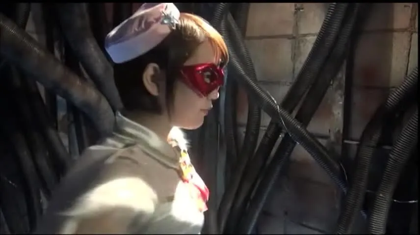 Watch an intense fight scene with Asian performers in cosplay, featuring dramatic poses and red masks in an industrial setting.