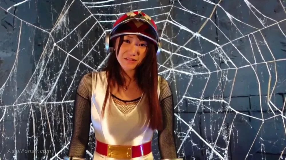 Watch an Asian girl in a costume posing in front of a spider web, surrounded by elaborate props and settings.