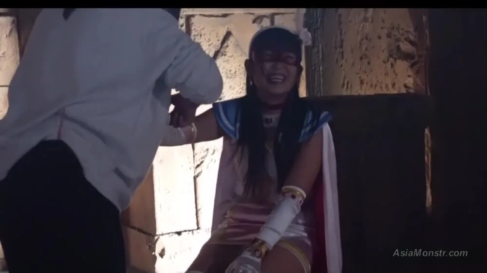 Watch an Asian girl in cosplay costume posing in a park and indoors, wearing a mask and revealing her slim figure