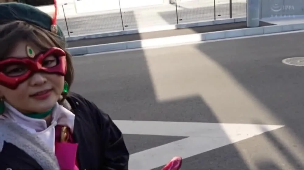 Watch an Asian woman dressed in a red mask and cape posing in various locations, from streets to studios, with a mix of natural and artificial lighting.