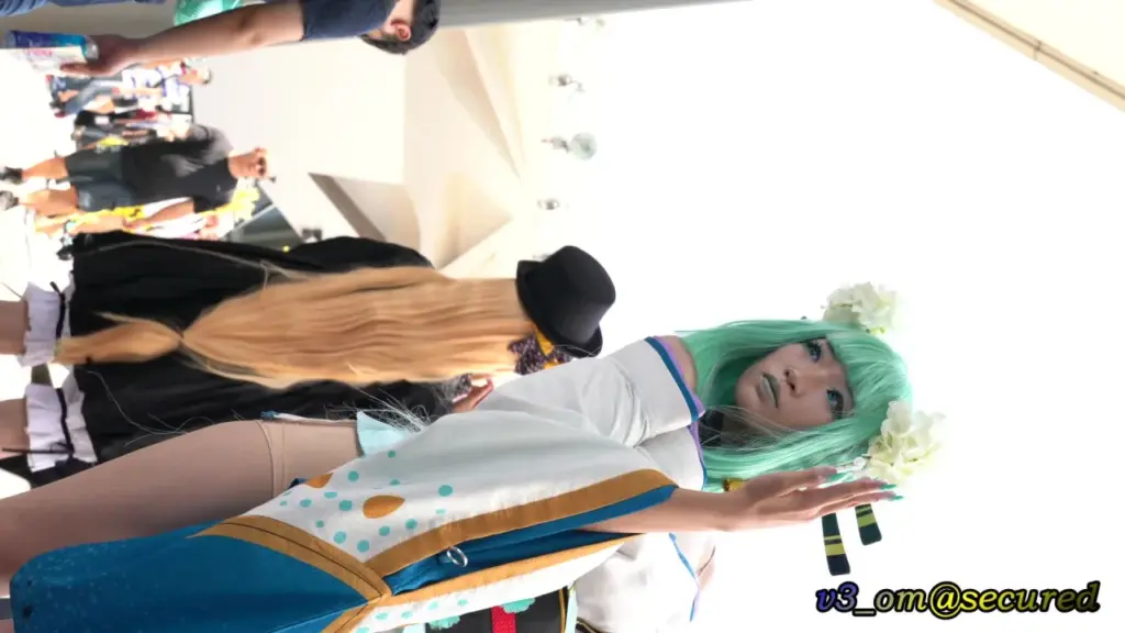 Watch three Asian girls in cosplay outfits posing at an outdoor festival, showcasing their tattoos and playful personalities.
