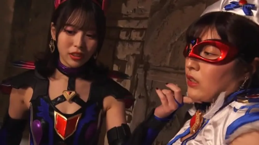 Watch Asian cosplay models in elaborate costumes and erotic poses, featuring stone walls, armor, and dramatic lighting.