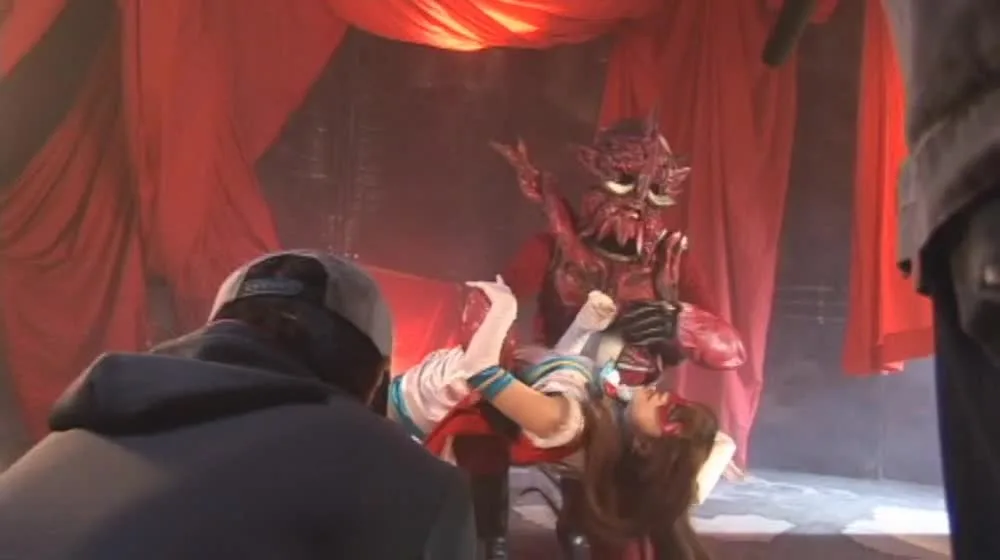Watch two Asian cosplay girls in a red cape being carried and restrained in various settings, including outdoor and indoor scenes.