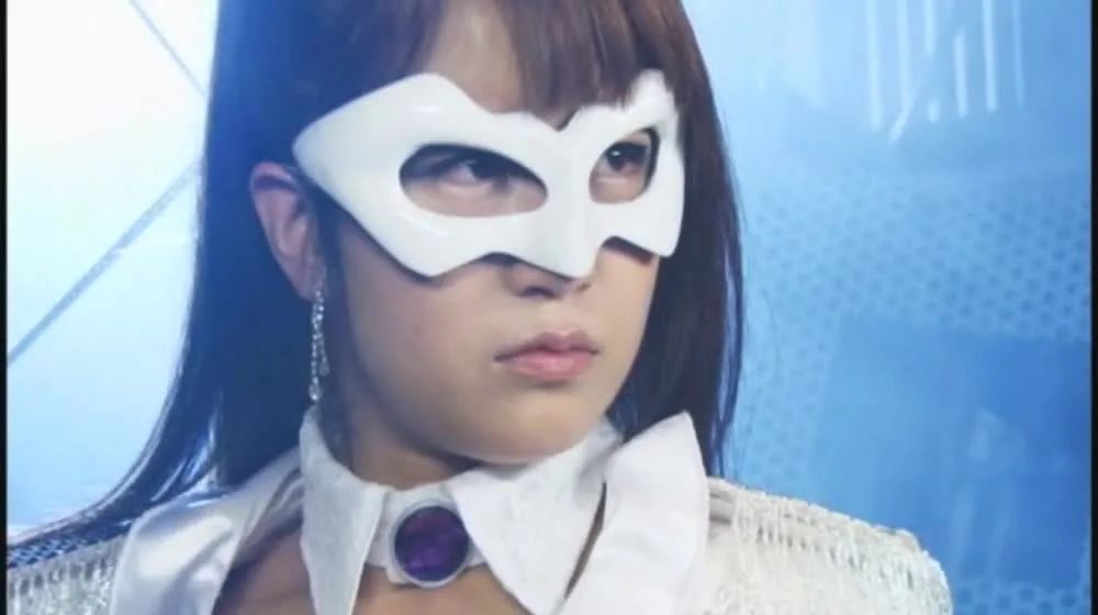 Watch a slim Asian woman in a white costume and mask, with a man, in a red BMW convertible on a highway.