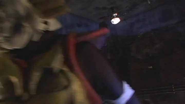 Experience the intense cosplay encounter between an Asian man and woman in a dimly lit basement, with armor and masks adding to the thrill