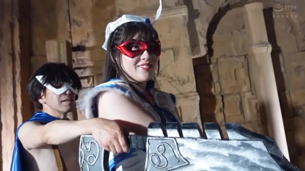 Watch Asian cosplay models posing with weapons in various settings, from dark stages to stone structures.