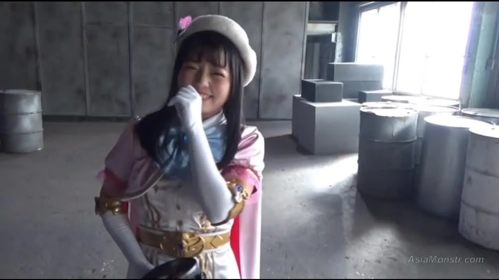 Watch an Asian performer in cosplay costume waving and posing in an industrial setting, caught on camera in a series of candid shots.