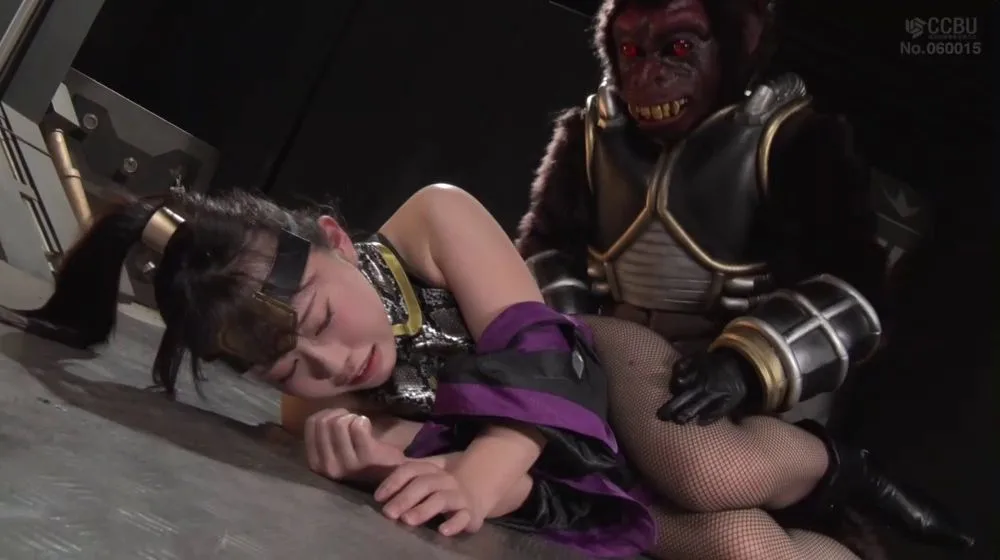Watch an Asian cosplayer in a black and purple costume being restrained and grabbed by a person in a monster costume in a dark indoor setting.
