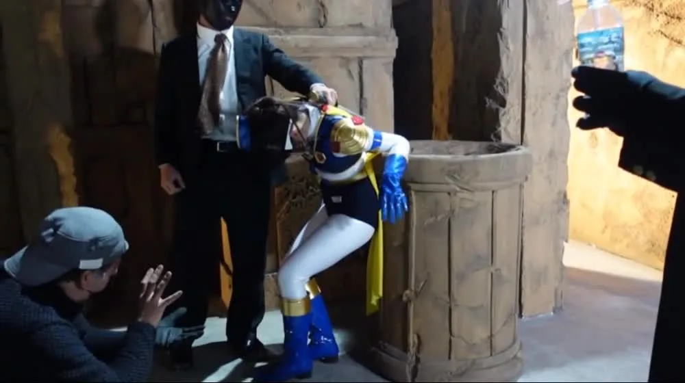 Watch an Asian performer in a costume engaging in various dramatic scenes with other actors in a studio setting.