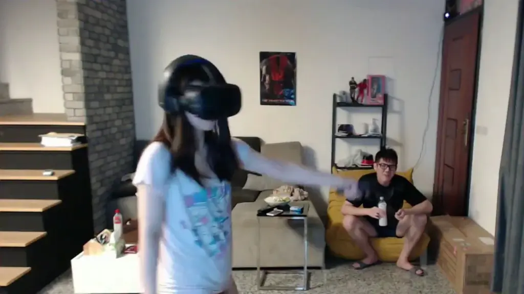 Watch a young Asian couple enjoy gaming together with VR headsets in their living room, a fun and intimate experience