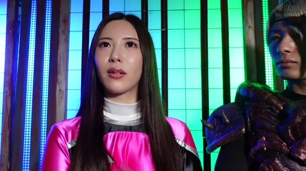 Watch an Asian couple with blonde male and black-haired female in elaborate costumes posing in a neon-lit studio with bars.