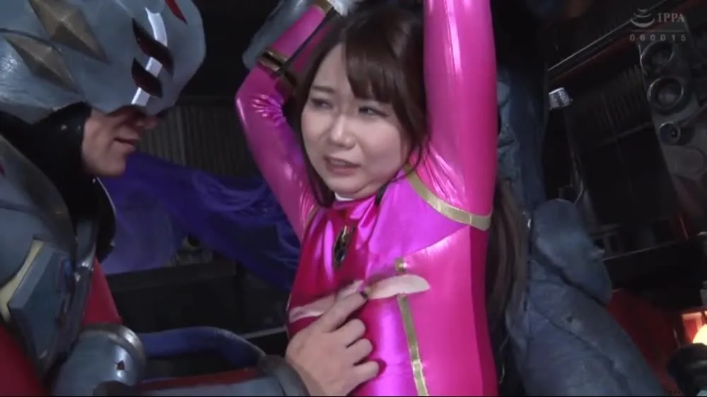 Watch an Asian couple in elaborate pink and armor costumes engaging in intimate moments in a dark, futuristic setting
