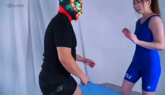 Watch an intense wrestling match between an Asian couple, with the male wearing a mask and the female in white lingerie.