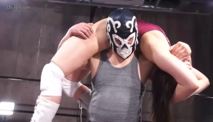 Watch intimate wrestling match between Asian couple in a ring, with mask and intense physical contact