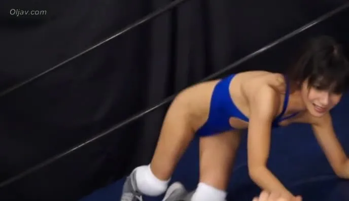 Watch intense Asian couple wrestling in a ring, wearing blue swimsuits, with a mix of medium and angled shots.