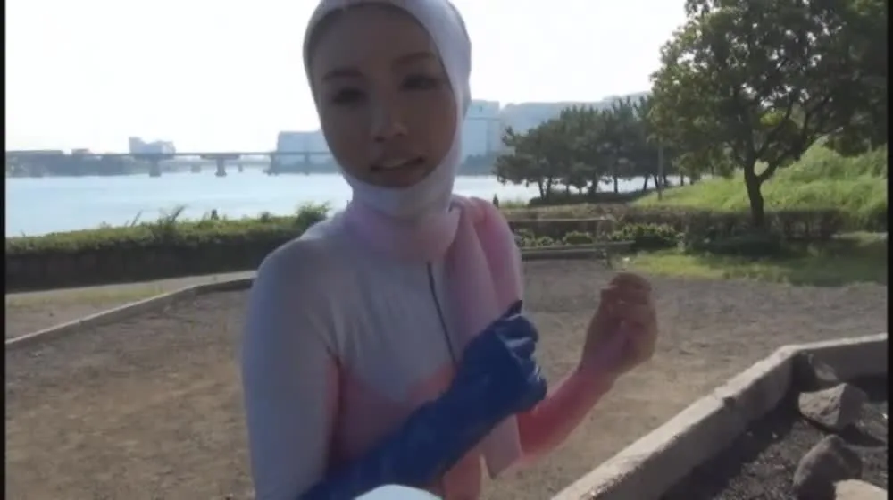 Watch a steamy outdoor scene featuring two Asian performers in pink bodysuits and a solo male office scene