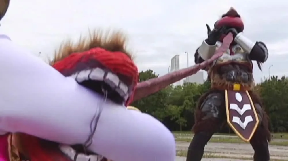 Watch an Asian girl with brown hair in a ponytail fight with a muscular man in an outdoor setting with trees and buildings