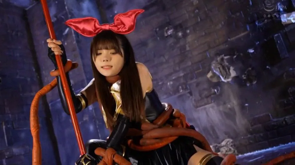 Watch an Asian girl in a black and gold costume being restrained by tentacles in a dark dungeon. Close-ups of her boots and sensual poses.