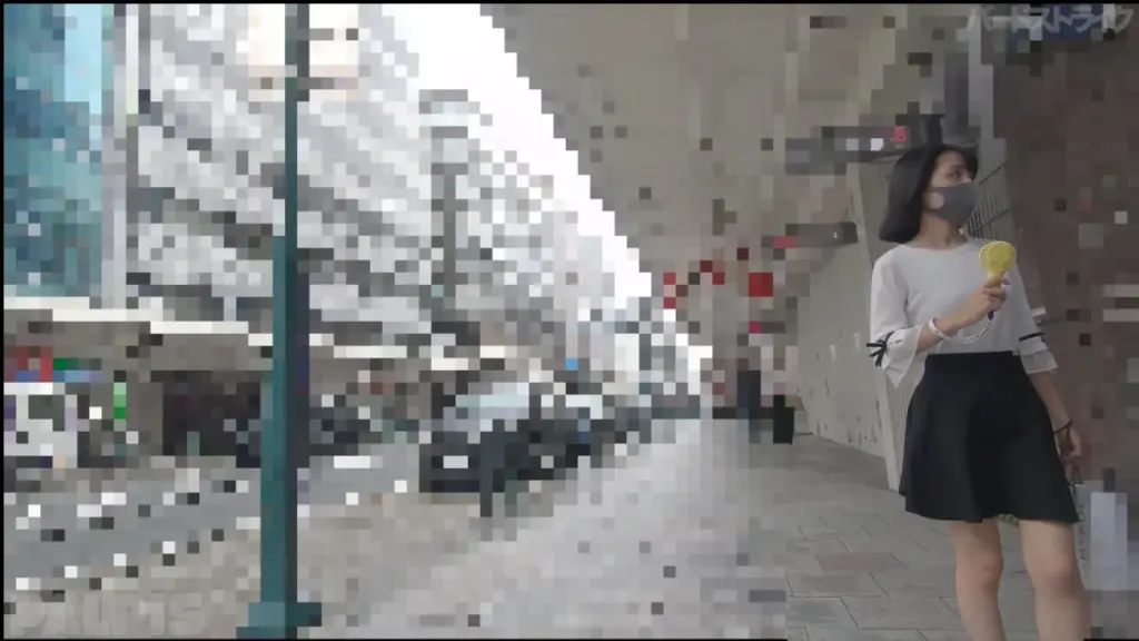 Watch an Asian girl in a black skirt and white blouse walking on a city street in daylight