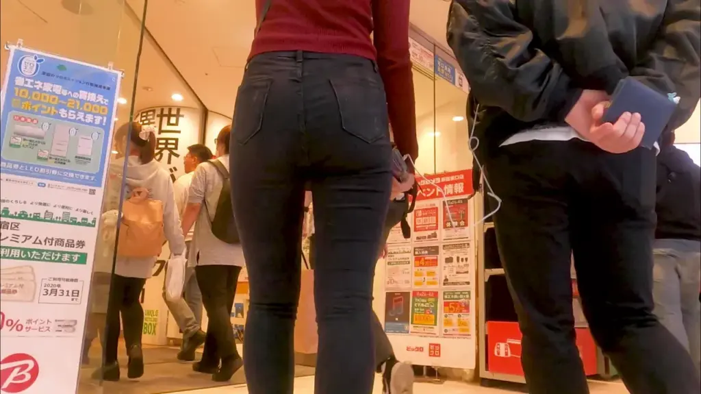 Watch an Asian girl in her 20s walking on a city street and standing in a clothing store, captured in POV style