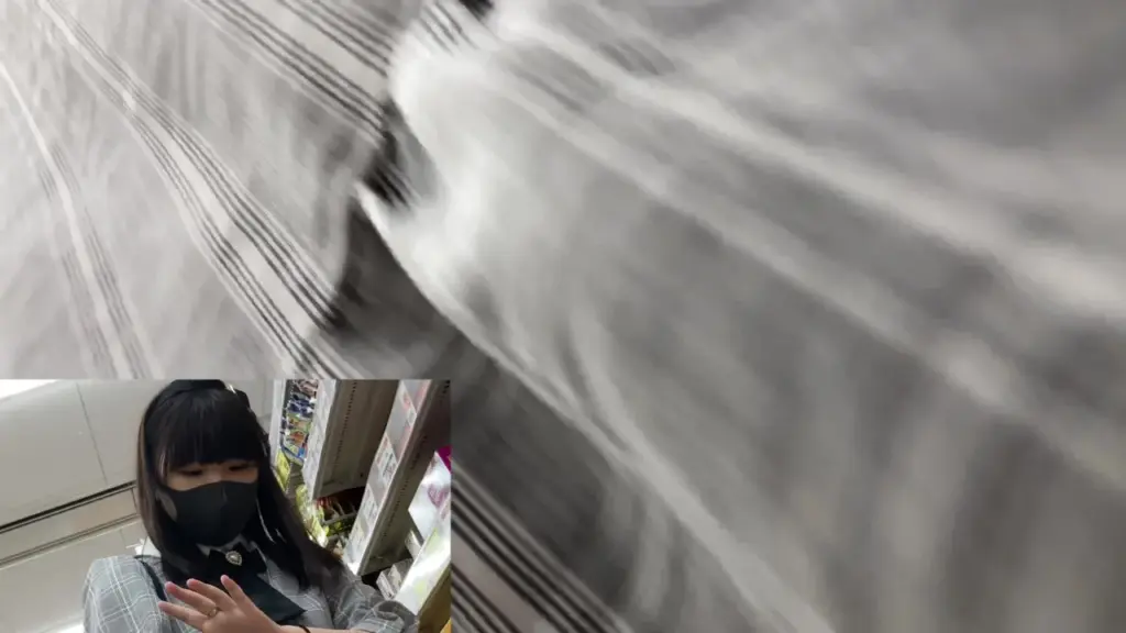 Watch Asian girl in gray plaid shirt in store setting, engaging in intimate moments, captured in various camera angles