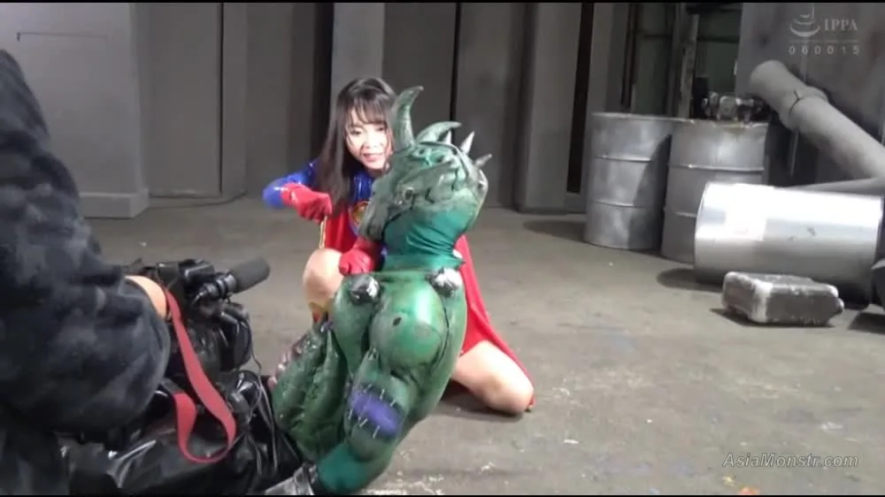 Watch an Asian girl interact with a man in a green costume in an industrial warehouse setting, with explicit content and varied camera angles