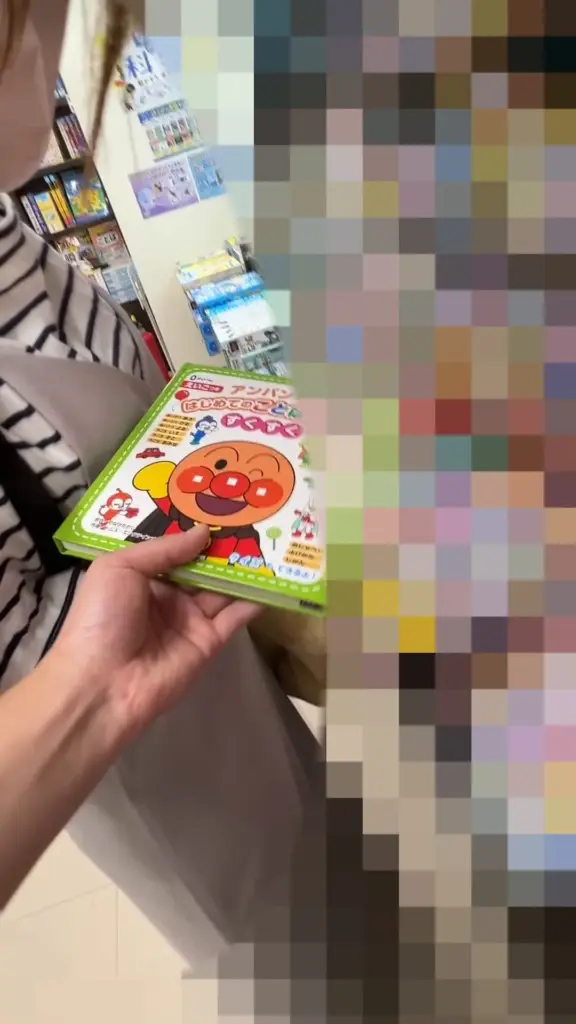 Watch an Asian girl in a mask and striped shirt explore a library or store, with a focus on her slender figure and brown ponytail