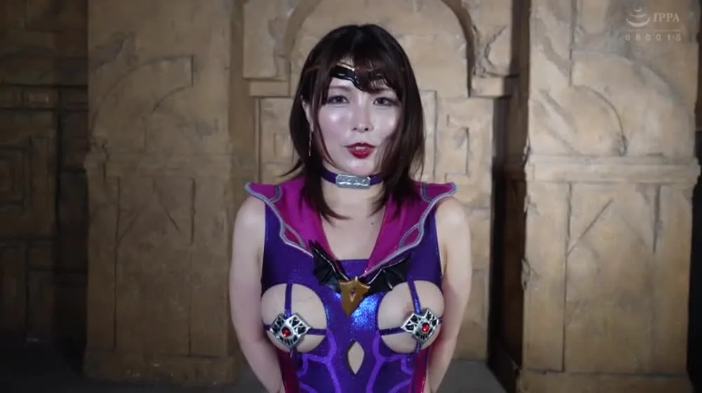 Watch an Asian girl in her 20s with brown hair and red lipstick posing in a purple and pink costume in an ancient temple setting