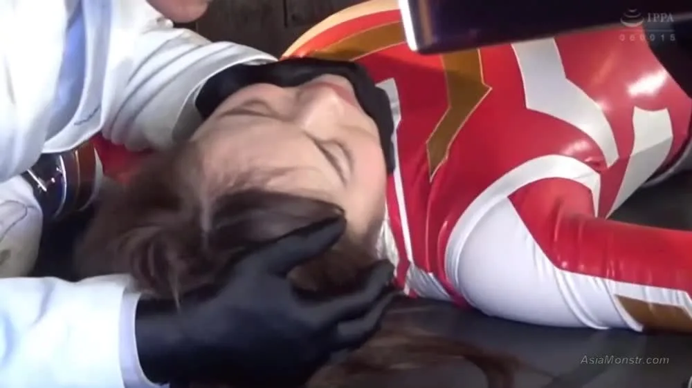 Watch an Asian girl in a red bikini being restrained and dominated by men in masks in a dimly lit setting