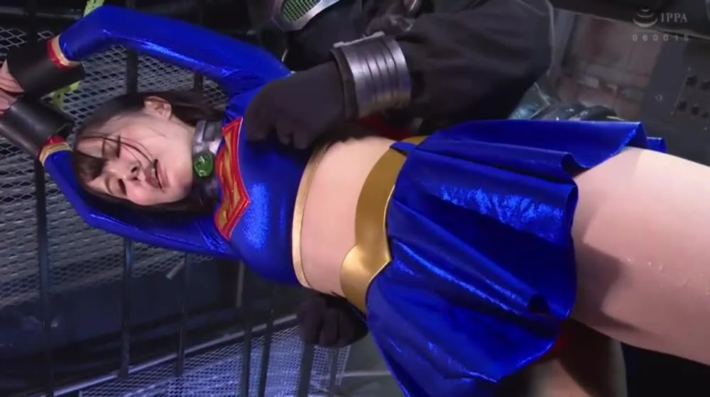 Watch an Asian girl in a red cape and blue skirt restrained in an industrial dungeon setting with dramatic lighting and intense bondage.