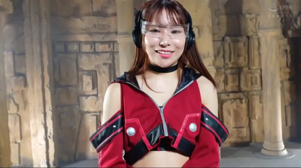 Watch an Asian girl in a red jacket pose in various futuristic settings, from stone hallways to dark rooms with dramatic lighting.