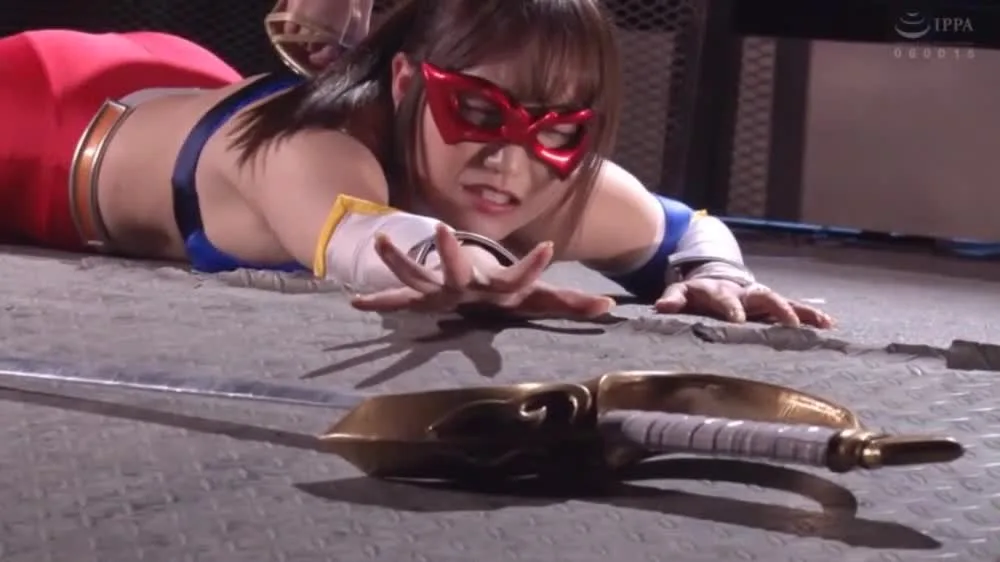 Watch a slim Asian girl in a red mask and blue outfit engage in an intense fight with a sword in an industrial setting