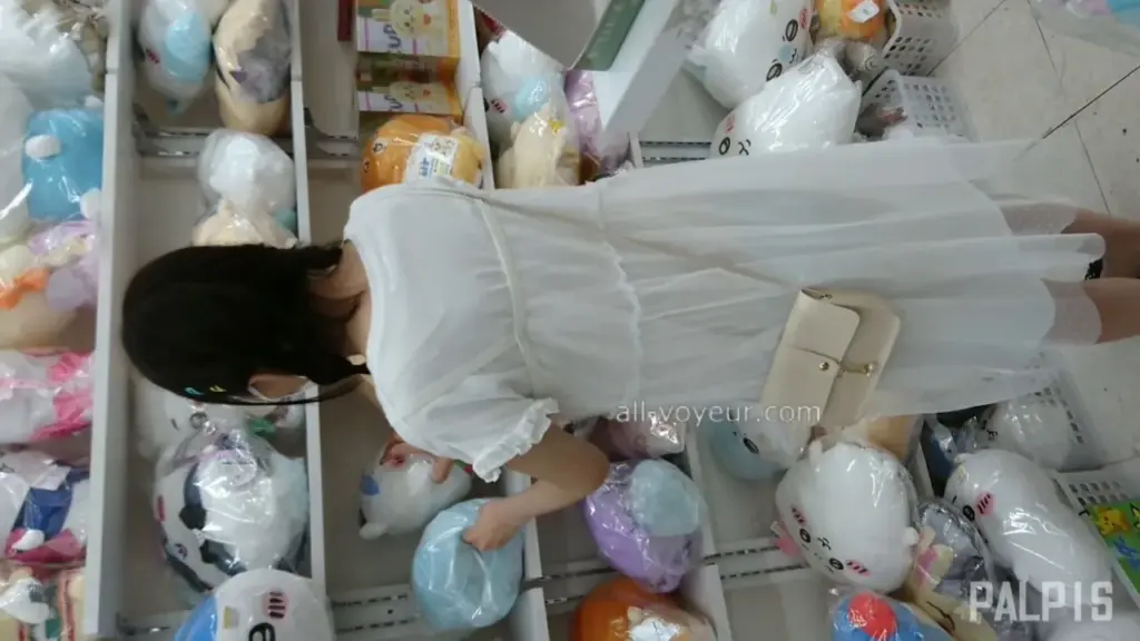 Watch a slim Asian girl with short black hair in a store fetish scene with bending and reaching poses