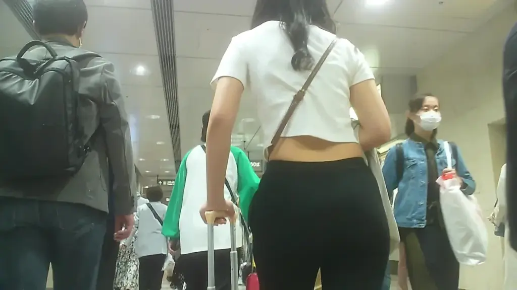 Watch an Asian girl in her 20s with black hair in a ponytail walking with a suitcase in a public area, then standing near a machine.