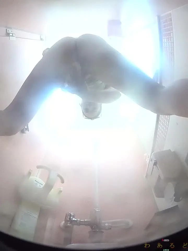 Watch a slim Asian girl with short black hair urinating in a bright bathroom from a POV perspective
