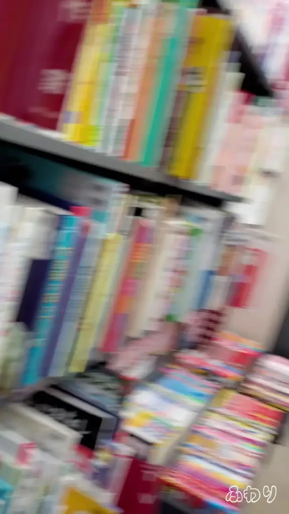 Watch a slim Asian girl in her 20s get intimate in a fluorescent-lit bookstore, surrounded by bookshelves